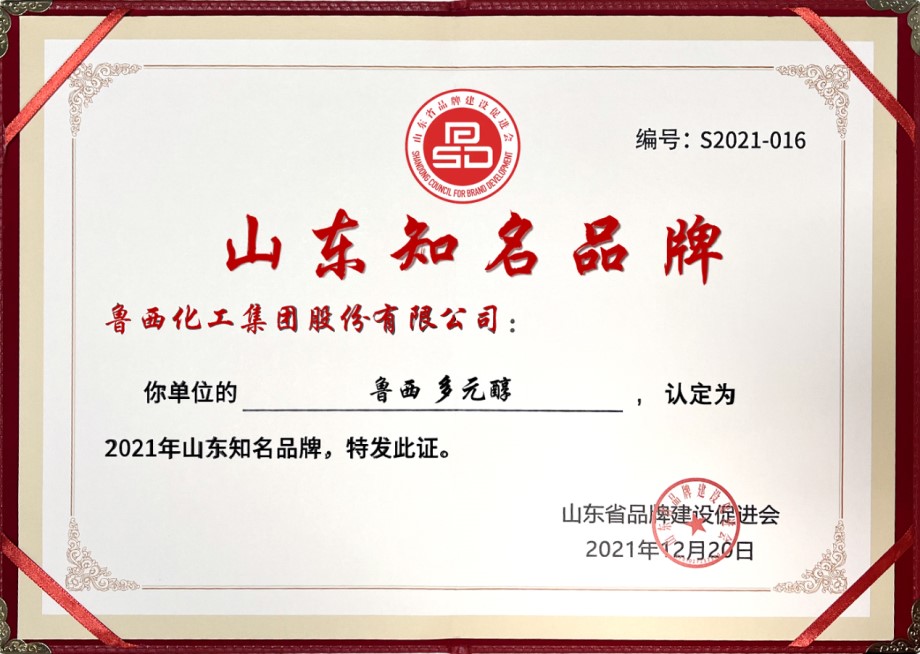 魯西集團:多元醇產品榮獲“山東知名品牌”稱號